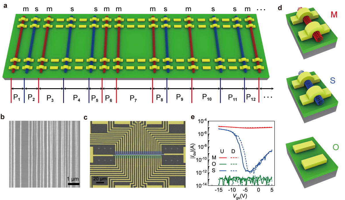 北京大学碳基电子学研究中心、纳米器件物理与化学教育部重点实验室、纳光电子前沿科学中心的张志勇-彭练矛联合课题组首次提出了孪生物理不可克隆功能(PUFs)的概念,在化学气相沉积法生长的碳管阵列上成功制备了孪生PUFs,并演示了其在加密通讯上的应用。碳管阵列在垂直于生长方向具有手性、位置随机性,而在平行方向具有一致性。在这种碳管阵列上制备的场效应晶体管具有三种不同的电学性质,即开路(0,无碳管)、半导体(S,纯半导体碳管S)和金属(M,至少一根金属碳管)。由于碳管的位置和手性是由随机成核和随机催化剂分布决定,所以晶体管将随机地显示O、S和M类型,其顺序既不可预测,也不可克隆。碳管在生长方向可以保持数百微米长度的性质不变,故在同一个碳管阵列上平行制造的两排晶体管阵列会显示出具有相同顺序的O、S和M类型,因此可以实现同时制备两个相同的孪生PUFs。对于一般的非孪生PUFs,在加密通讯前,需要把密钥存储在非易失性存储器,再分享给参与通讯的其他人,故降低了安全性,而孪生PUFs无需提前提取密钥,从而大大提高了安全性。