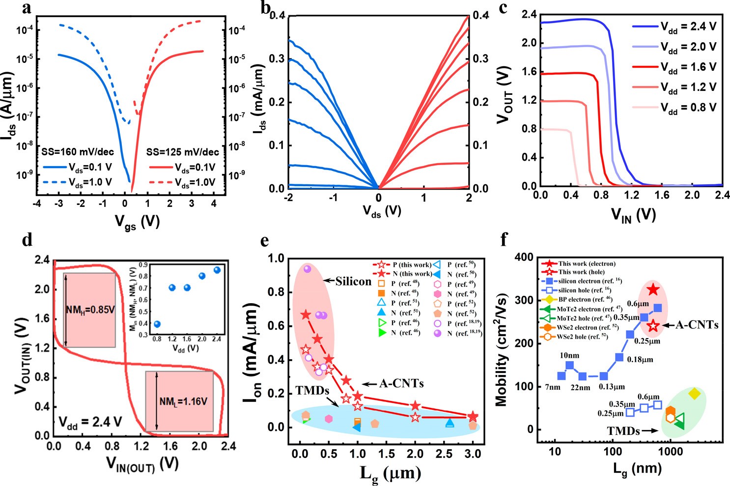 北京大学电子学院、碳基电子学研究中心、纳米器件物理与化学教育部重点实验室张志勇教授课题组对基于阵列碳管的N型晶体管深入进行研究,发现器件性能和成功率不高的根本原因在于以低功函数作为接触的N型晶体管在金属-碳管界面处的氧化(图1)。团队开发出衬底疏水性处理和降低阵列碳管的密度(图2a-b)两种方法,有效解决了金属-碳管界面处的氧化问题,制备出高性能N型晶体管。典型300nm栅长的晶体管饱和电流和峰值跨导分别达到600mA/mm和225mS/mm(图2c-f),归一化性能相比于此前报道的碳管N型晶体管提升了1-2个量级,展示了良好的长期稳定性。在此基础上,团队开发了基于阵列碳管的高性能CMOS器件与电路工艺(图3)。500nm栅长的CMOS晶体管展示出几乎对称的性能,开态电流可达400mA/mm(图4)。基于阵列碳管的CMOS器件电子与空穴的迁移率分别为325和241cm2V-1s-1,高于同尺寸硅基和二维过渡金属硫化物(TMDs)制备的CMOS器件(图5),充分展示了碳纳米管电子器件在高性能CMOS电子领域的应用潜力。