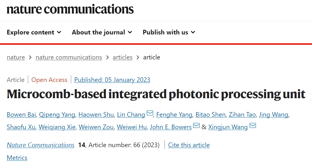 2023年1月5日,电子学院王兴军课题组-常林课题组在Nature Communications杂志在线发表文章“Microcomb-based integrated photonic processing unit”。文章首次报道了一种基于光子神经网络的超高算力密度硅基集成光子处理器。研究团队历时3年,攻克了多波长并行光计算系统校准和超高精度权重加载两个世界性技术难题。