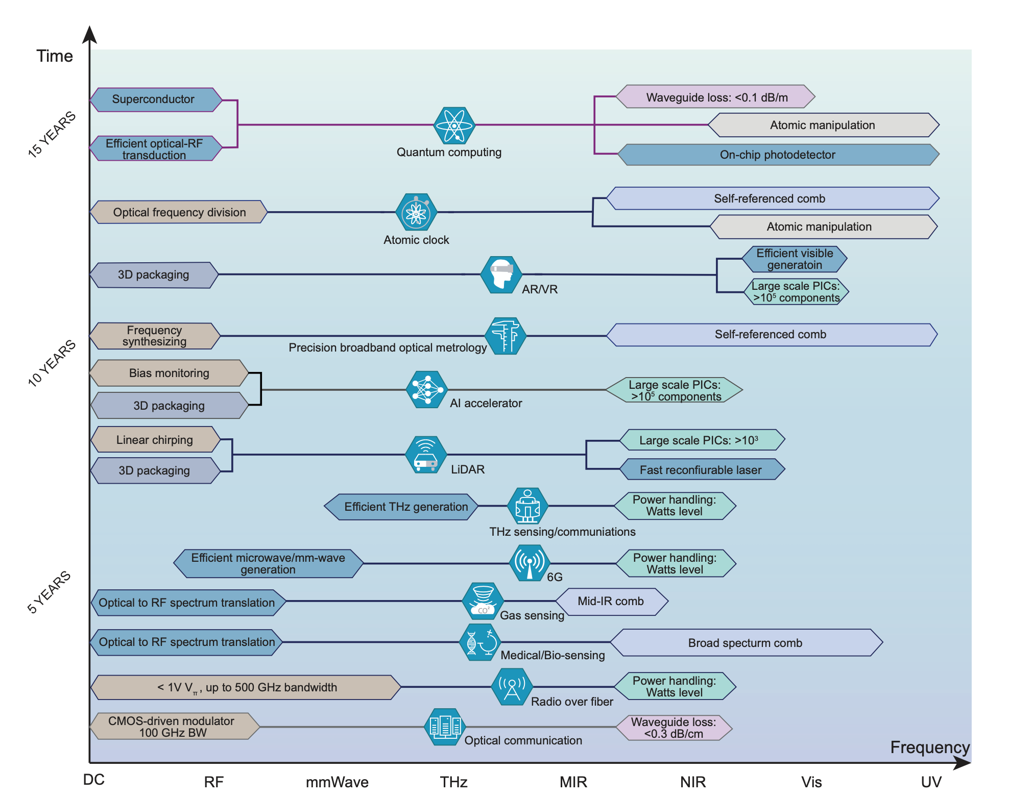 LN的材料特性使之能产生和处理从紫外线频段到微波频段的电磁频率,范围涵盖了近五个数量级。在可见和紫外光频段,材料损耗非常低,产生方法是利用非线性效应,应用场景有视觉应用和原子跃迁探测;在近红外频段,由于低传输损耗有广泛的应用,例如光通信、微波光子学、量子光学和光探测等,产生近红外频率电磁波的方法也很多样,例如拉曼激光、DFG、基于克尔效应的超连续谱产生、电光梳等;在中红外频段,可以用于空气质量监测等场景,这一频段的光可以通过超连续谱产生和克尔效应得到;太赫兹频段可以穿透纸张、塑料和织物,因此被用于传感和安全成像,窄带、高强度的太赫兹电磁波可以通过LN晶体中的光学整流生成;微波频率被用于5G和6G通信、雷达和射电天文学等领域,这一频段可以利用LN的声光、电光效应,将微波频率转换到光载波上。
