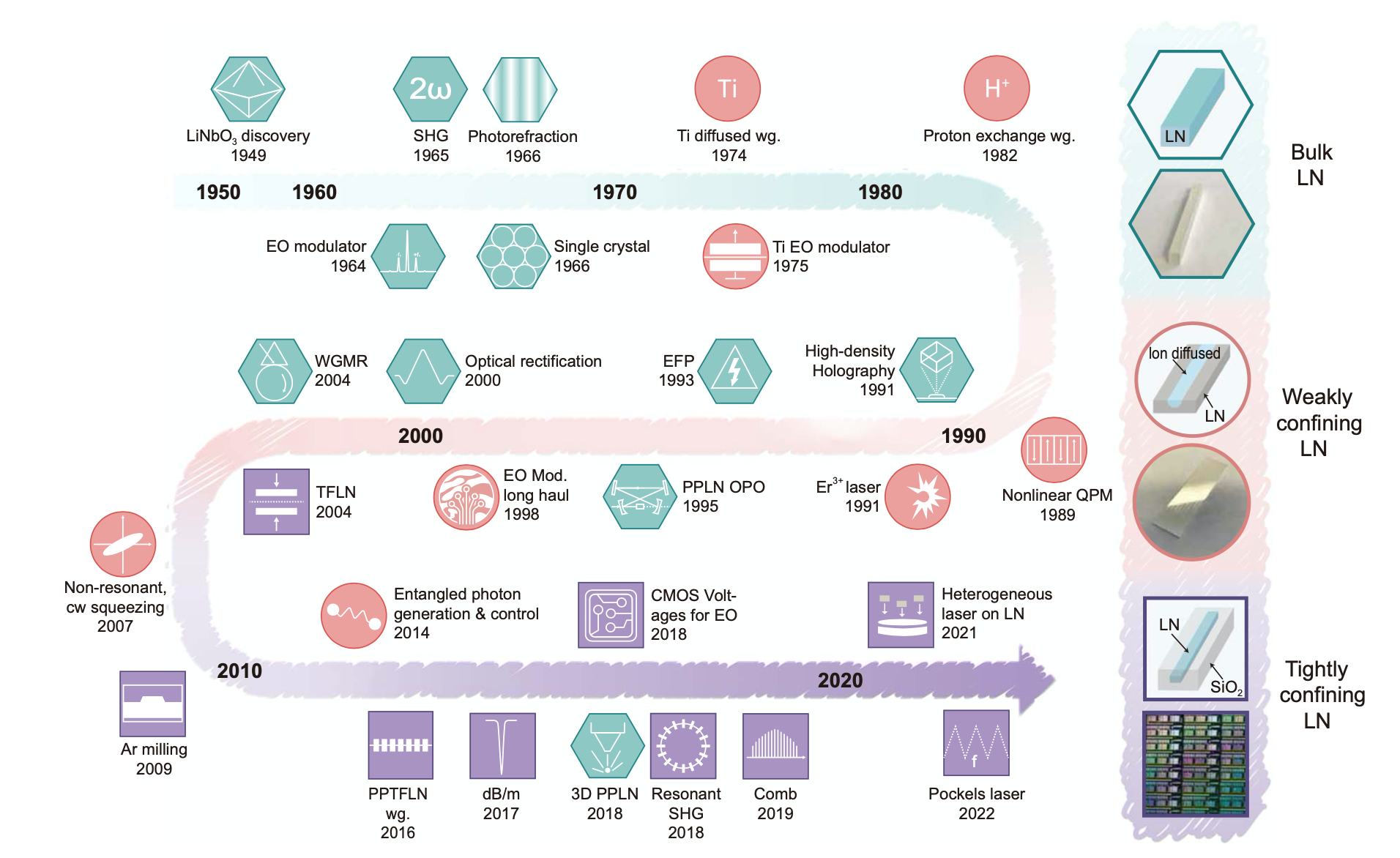 图 1 铌酸锂所为光子材料的发展时间线