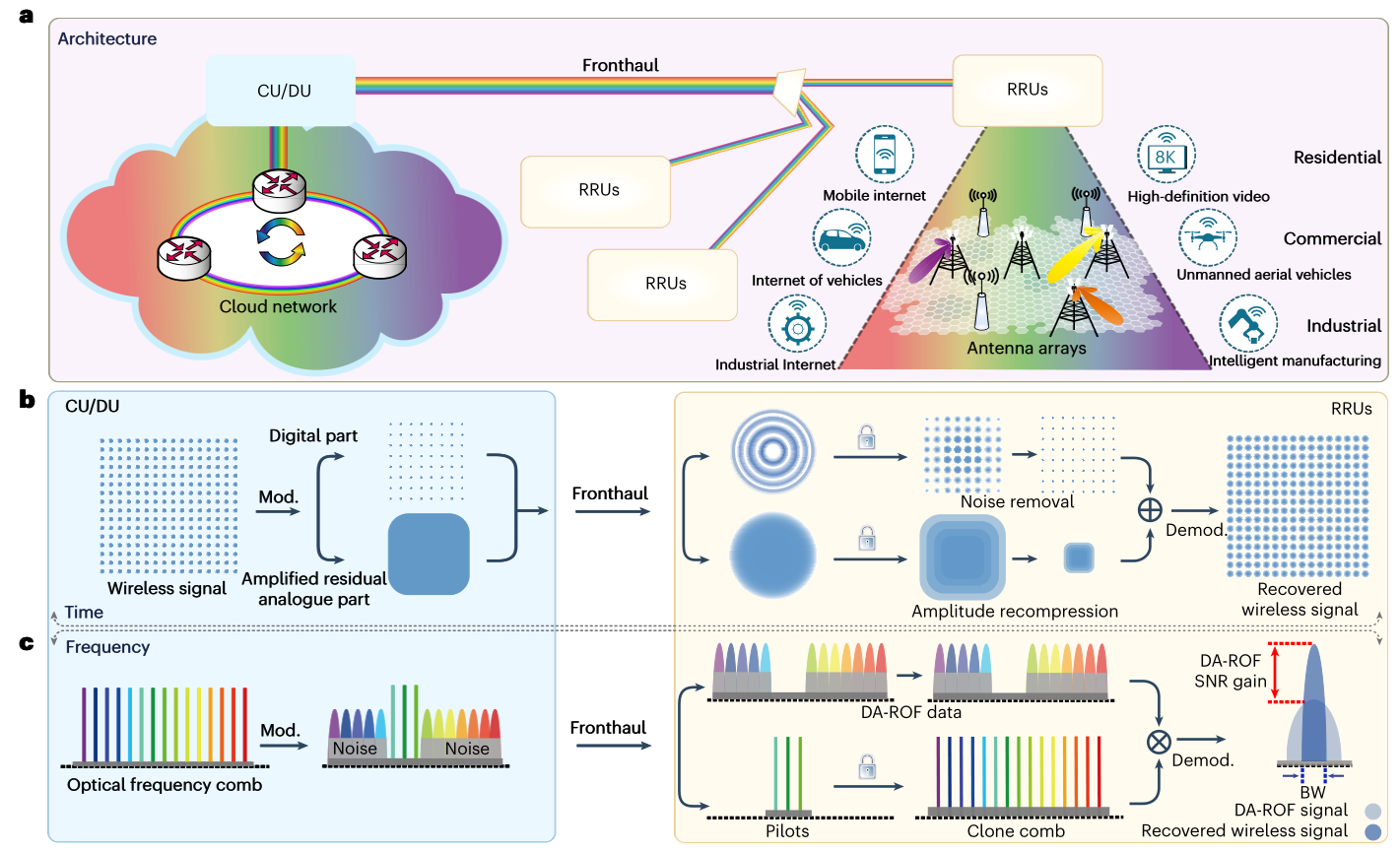 近期,同属区域光纤通信网与新型光通信系统国家重点实验室的北京大学电子学院微波光子团队与上海交通大学电子工程系新型光网络研究团队合作,针对后5G时代光载无线接入网容量和信噪比受限的挑战,创造性地提出了基于克隆光梳的数字模拟混合前传接入架构,成功实现了超大容量和超高制式的无线信号前传接入。2023年8月17日,相关研究成果以“克隆光梳赋能大容量高调制格式数字模拟前传”(Clone-comb-enabled high-capacity digital-analogue fronthaul with high-order modulation formats)为题,在线发表于《自然·光子学》(Nature Photonics)。