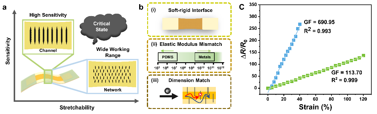 图1. a) 裂纹应变传感器灵敏度和可拉伸性与裂纹形貌的关系及其临界状态;b) 应变调控策略:软硬界面、扩大模量失配和尺寸匹配;c) 高灵敏度和高可拉伸应变传感器响应曲线