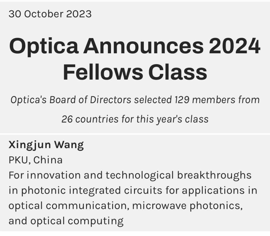 近日,美国光学学会(Optica)宣布了2024年度新当选会士(Fellow)名单,来自26个国家的129名科学家新当选为美国光学学会会士(Optica Fellow)。电子学院王兴军教授因其在面向光通信、微波光子和光计算系统应用的光子集成芯片研究领域开创性的贡献(For innovation and technological breakthroughs in photonic integrated circuits for applications in optical communication, microwave photonics, and optical computing)当选2024年度美国光学学会会士。