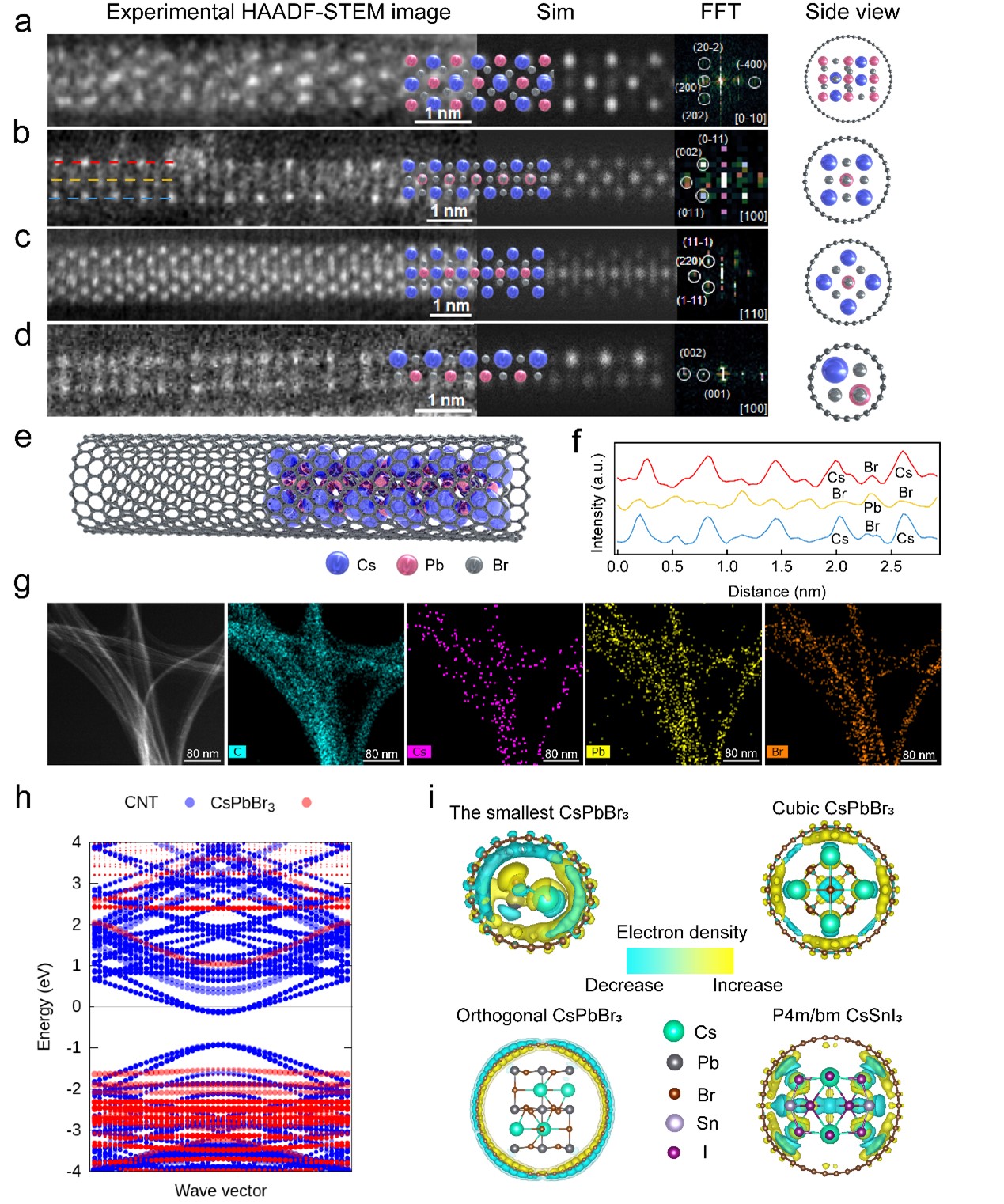 图1:同轴异质结的的内填充钙钛矿原子结构和DFT计算能带情况