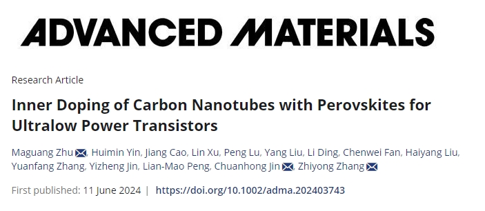 相关成果以题为“Inner doping of carbon nanotubes with perovskites for ultralow power transistors”的论文,于6月11日在线发表于《Advanced Materials》(Adv.Mater.2024, 2403743)。原北京大学电子学院博雅博士后(现为南京大学研究员)朱马光、浙江大学博士生殷慧敏、中科院微电子研究所曹江研究员、北京大学徐琳博士为共同第一作者,北京大学电子学院张志勇教授、浙江大学材料学院金传洪教授与南京大学朱马光研究员为共同通讯作者。