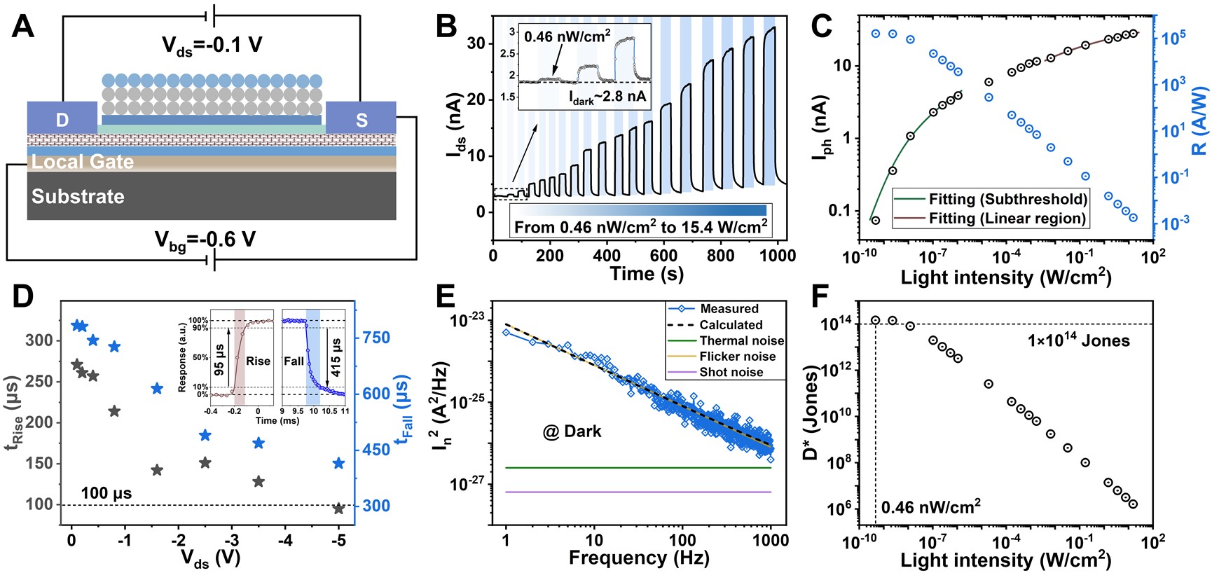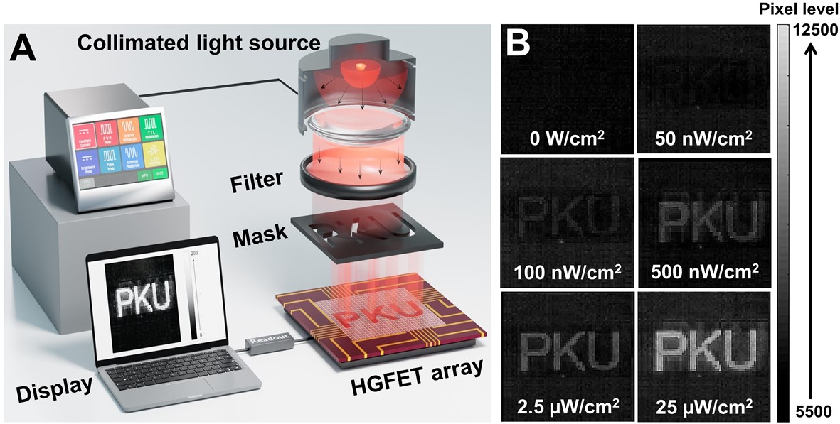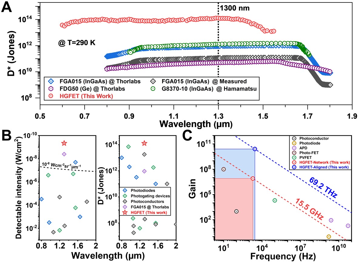 近日,北京大学电子学院、碳基电子学研究中心、纳光电子前沿科学中心、重庆碳基集成电路研究院的张志勇教授团队联合北京交通大学物理科学与工程学院王颖副教授团队开发了一种异质结栅场效应晶体管(HGFET,图1),利用光电解耦机制,实现了对信号的超高增益,而基本不放大噪声,获得了对短波红外探测的比探测率达到1014Jones,充分满足了星光夜视的需求。团队采用高纯半导体碳纳米管网状薄膜作为半导体沟道构建MOS晶体管,在其栅介质上制备硫化铅量子点/氧化锌异质结光电二极管作为栅极,实现了光传感和电放大的物理空间隔离。该光电晶体管暗电流低,对极弱红外光(1300 nm,0.46 nW/cm2)具有显著的响应(图2),而且具有超高的本征增益和响应度、较低的噪声和较高的响应速度,在高增益模式下,峰值比探测率超过1014Jones。在同等测试条件下,碳基HGFET探测器比商用的InGaAs探测器的比探测率高出两个量级,并在增益带宽积上相对于已有探测器显示出明显优势(图3-4)。团队还基于碳基HGFET光电晶体管实现了64×64像素的板级成像芯片,初步演示了光强低至100 nW/cm2的弱光环境成像(图5)。更为重要的是,碳基HGFET探测阵列可以在硅基IC上利用后道工艺集成,通过通孔直接与硅基读出电路链接,可以将像素间距缩减到5微米以下,实现超高分辨率成像。