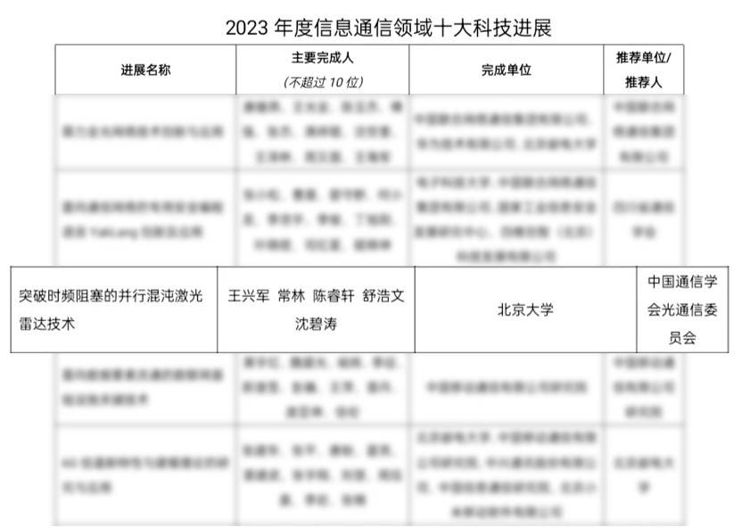 近日,2024中国信息通信大会在成都顺利召开,中国通信学会公布了2023中国通信学会信息通信领域年度十大科技进展名单,由电子学院王兴军教授牵头,舒浩文研究员、常林研究员联合完成的“突破时频阻塞的并行混沌激光雷达技术”项目荣获十大科技进展。