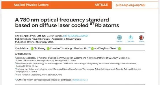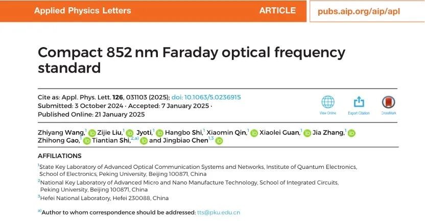 2025年1月21日,电子学院陈景标教授团队在AIP出版社旗下的国际学术期刊《Applied Physics Letters》上,同时发表了光钟研究两项成果:“A 780 nm optical frequency standard based on diffuse laser cooled87Rb atoms”和“Compact 852 nm Faraday optical frequency standard”。陈景标教授团队提出了与光晶格原子钟和离子光钟完全不同的两种光钟新方法,相比光晶格原子和离子光钟,原理上仅需一台激光器或加上移频、不需要昂贵的PDH系统。低成本和低复杂性的特点,具有空间站、星载、舰载、机载场景等实际平台的应用潜在优势。