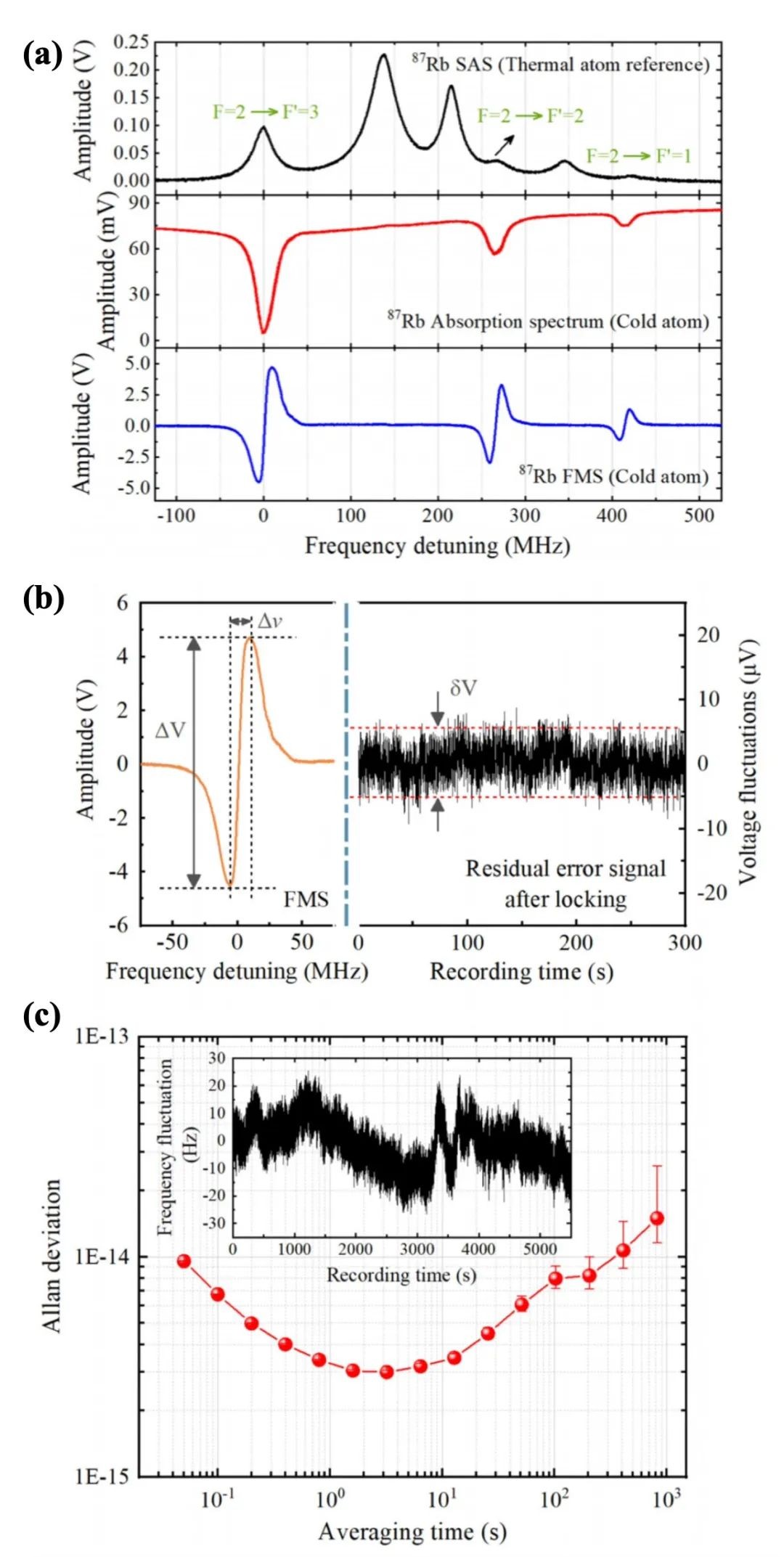 陈景标教授课题组在漫反射冷原子光钟领域取得进展,成果1中提出并原理验证了一种基于漫反射激光冷却铷原子的780 nm光钟方案。首次利用漫反射激光冷却技术制备出50厘米长的冷87Rb原子团,并以此作为量子频率参考,成功实现了基于频率调制谱稳频的780 nm冷原子光频标,有望发展成为空间冷原子光钟,促进空间科学、导航定位、波长标准领域的应用。