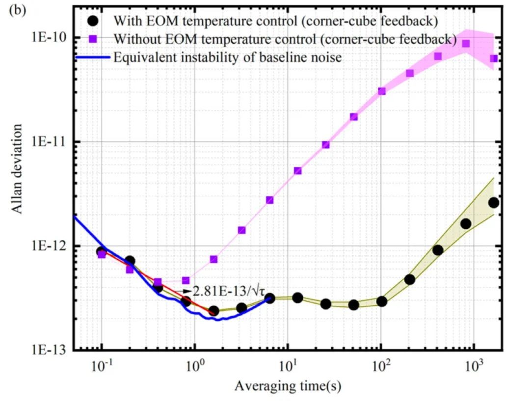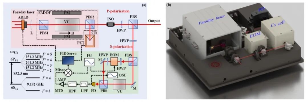 成果2中,陈景标教授课题组在法拉第光钟领域取得进展,基于北京大学自主原创的原子选频法拉第激光器,实现了基于133Cs原子的852 nm紧凑型法拉第光频标。由于使用原子滤光器作为选频器件,法拉第激光器能够自动对准原子的量子跃迁谱线。因此,激光波长对环境变化具有很强的鲁棒性。通过两套光频标外差拍频,法拉第光频标的稳定度为2.81 × 10-13√τ该成果的小型化和环境适应性为需要高频率稳定性的星载、舰载、机载等应用场景提供了一种实用且可靠的光钟解决方案。
