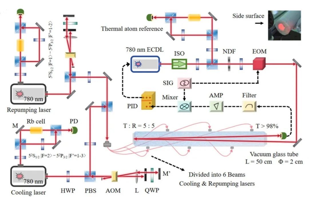 但构建光晶格原子或离子光钟一般需要5台以上不同波长的稳频激光器,且钟跃迁激光需匹配Pound-Drever-Hall(PDH)技术,对腔体材料和工作环境有着极其严苛的要求,系统庞杂、成本昂贵,大多被限制在实验室内。