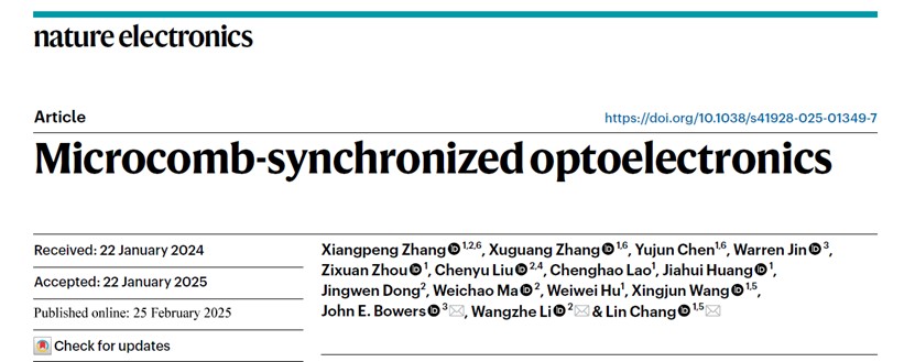 2025年2月25日,电子学院常林研究员团队与中国科学院空天信息研究院李王哲研究员课题组合作,在Nature Electronics杂志在线发表了题为“Microcomb-synchronized optoelectronics”的研究文章,在世界上首次实现了光子芯片时钟在信息系统中的应用。该技术基于可量产的超低损耗氮化硅光子芯片,通过光学频率梳生成了高精度、低噪声的时钟信号,突破了传统电子芯片在时钟带宽、能耗和噪声等方面的性能瓶颈。为未来超高速芯片的发展提供了重要解决方案。