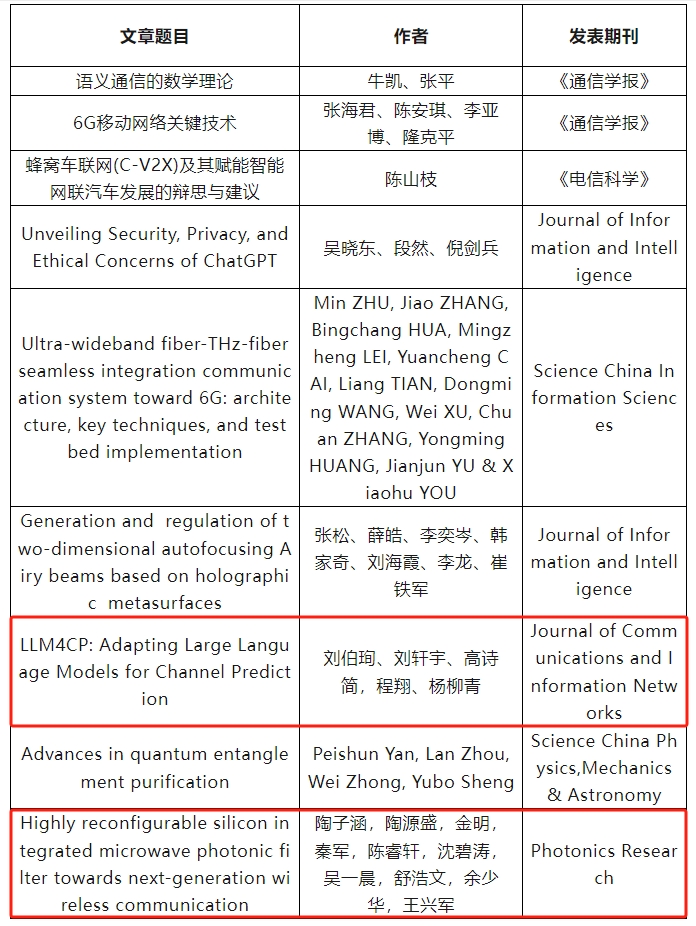 近日,中国通信学会发布了2024年度信息通信领域科技论文激励计划遴选结果,电子学院程翔教授团队发表在期刊Journal of Communications and Information Networks上的论文LLM4CP: Adapting Large Language Models for Channel Prediction和王兴军教授团队发表在期刊Photonics Research上的论文Highly reconfigurable silicon integrated microwave photonic filter towards next-generation wireless communication均成功入选。