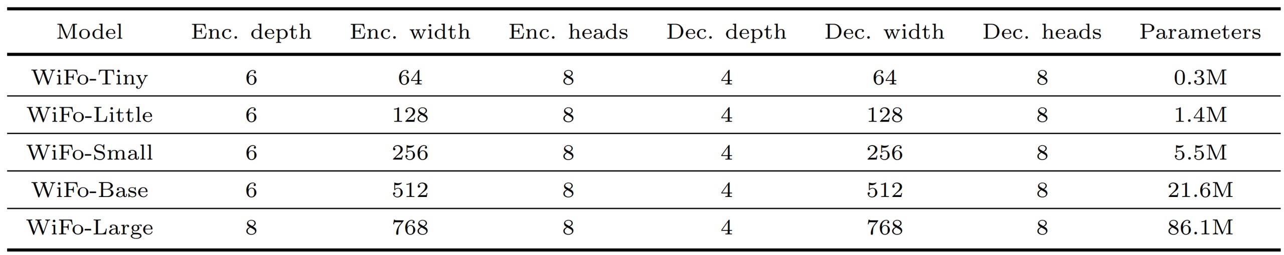 表2 WiFo的5种模型参数配置
