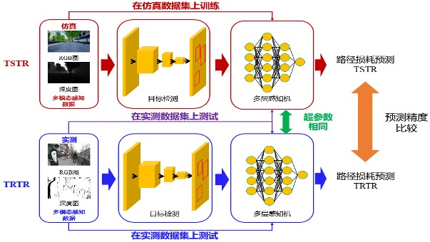 (4)验证层面:为全面验证构建的仿真SynthSoM数据集的可信度和可用性,首次开展对于SynthSoM数据集的基于统计的定性分析以及实测注入的性能扩展性测试。针对基于统计的定性分析,结果表明在不同场景和条件下所采集的仿真数据与实测数据展现出一致的电磁传播机制;针对实测注入的性能扩展性测试,基于数字孪生技术,在北京大学校园场景搭建精准匹配的实测与仿真场景(如图3所示),采集时空一致的实测与仿真多模态通感数据。基于此,进一步开展在仿真数据训练,在实测数据测试(TSTR)以及在实测数据训练和测试(TRTR),如图4所示。测试结果表明TSTR和TRTR的精度分别为89.28%和90.35%,证明了仿真数据与实测数据的高吻合度使得简单深度学习小模型也有能力实现零样本泛化。