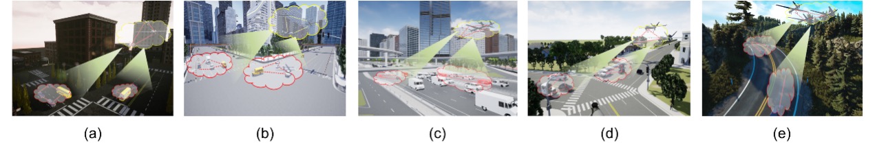 (3)场景层面:包含空地多路协同网联具身智能场景(网联智能无人车、低空经济无人机)下城镇、郊区、乡村(如图2所示),具有多时段、多天气、多视角、多车流量密度、多频段、多种天线阵列等丰富场景条件,并在不同场景和条件设置过程中采用了多种先进技术和算法,包括射线追踪、激光雷达光散射增强(LISA)算法、协同自适应巡航控制(CACC)汽车跟随模型用于防碰撞检测等。