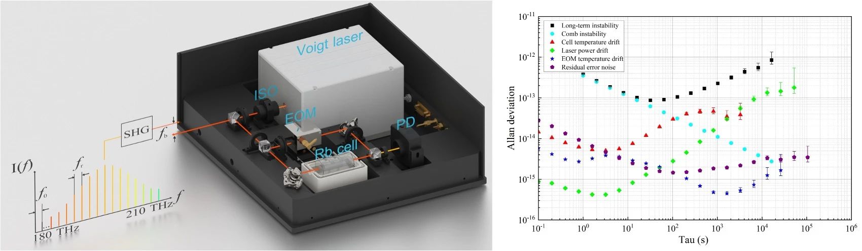 图4 佛克脱光频标实验系统(左)和频率稳定度指标(右)