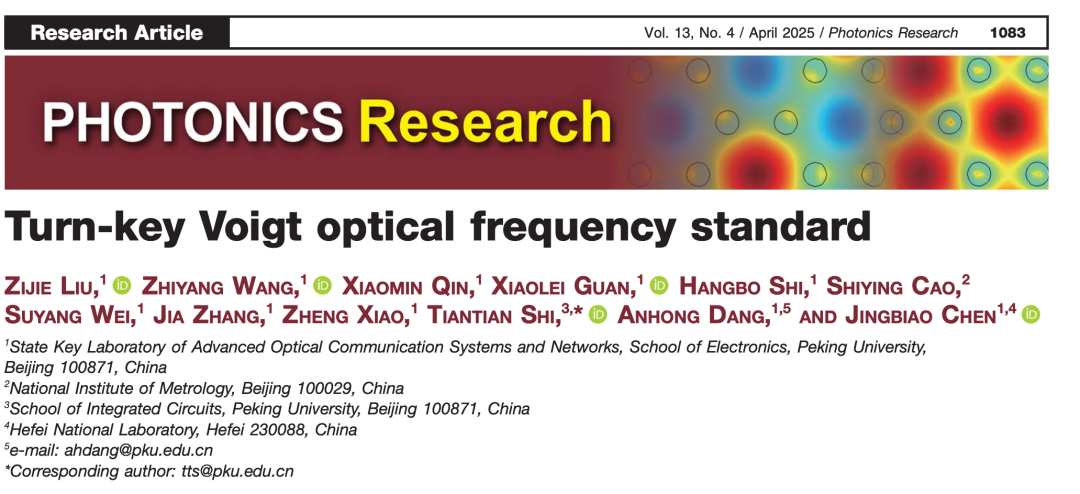 近期北京大学陈景标教授团队,于国际首次提出并实现了基于原子选频技术的佛克脱光学频率标准,实现了小型化光频标的全自动化高性能运行。该研究突破原子滤光器在光通信领域的低光强应用限制,提出基于原子选频技术的佛克脱激光(Voigt laser),利用其自动对准原子谱线的特性,结合全自动化调制转移谱(MTS)频率锁定方案,共同构筑了在恶劣环境下的具有高鲁棒性、可自动运行的高性能光钟。展示了原子选频激光器在小型化、无人化开发中的巨大潜能,为便携式原子钟设备在科研、军民两用的应用提供了新途径。相关研究成果以“Turn-key Voigtopticalfrequency standard”为题发表于Photonics Research 2025年第4期,被遴选为封面文章。