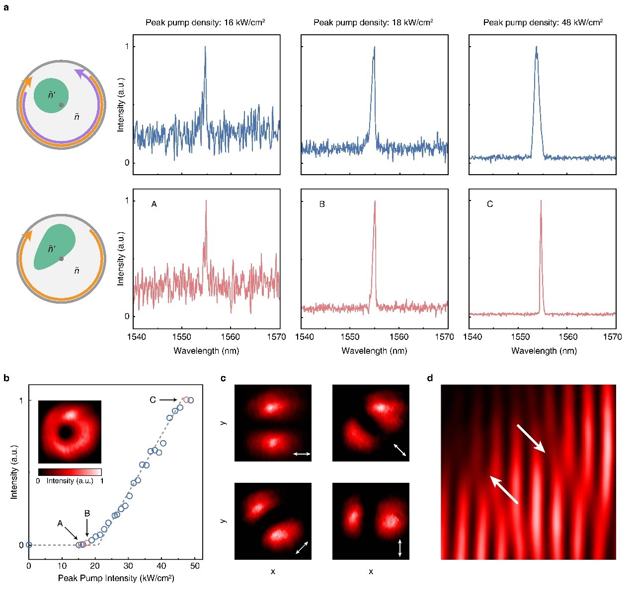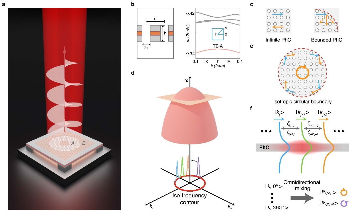 研究团队从实空间与动量空间的傅里叶对偶性出发,设计了一种圆形边界的有源光子晶体。在圆形边界散射效应作用下,原本独立传播的多个光子晶体导模发生各向同性耦合,进而形成二重简并的集体导模共振态(collective guided resonances, CGRs)。在保持镜面对称下,两个简并模式携带相反的手性涡旋。进一步,团队利用非对称泵浦技术破缺手性对称性,实现了手性涡旋激光的单模激射。团队成功观测了实空间中心处强度为零的涡旋光束,并通过偏振分布及自干涉测量证实涡旋中心处纯粹相位奇点,体现为自干涉条纹呈现为一对朝向相反的“叉”(fork)型图案。上述结果证实了激光光束携带非零的手性轨道角动量。