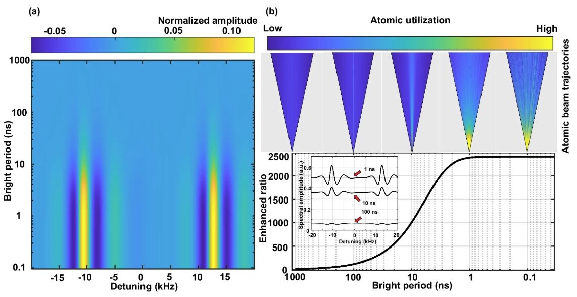 针对钙原子束光钟中原子利用率长期偏低的技术瓶颈,电子学院陈景标教授团队提出纳秒拉姆塞光谱(Nanosecond Ramsey Spectroscopy)技术。通过将光–原子相互作用时间压缩至纳秒量级并在时间域内精确控制光与原子相互作用的时间窗口,使原子渡越时间与横向多普勒速度分布实现精确匹配,从而使所有横向速度的原子均能参与拉姆塞干涉过程,实现对原子束中横向速度的100%覆盖。理论研究表明,该技术可使光谱幅度提升超过 2300 倍,使系统的量子投影噪声极限频率稳定度提升至 1.2 × 10⁻¹⁷ √τ ,媲美冷原子光晶格钟。该技术无需引入激光冷却系统,不增加系统复杂度,适用于连续运行和工程化集成,为构建高稳定度的钙原子束光钟开辟了关键技术路径,并有望在高精度导航、深空测量、光学时频网络及国家时间基准构建中发挥重要作用,为下一代高精度时频体系乃至时间的基本单位“秒”的未来重新定义提供坚实支撑。