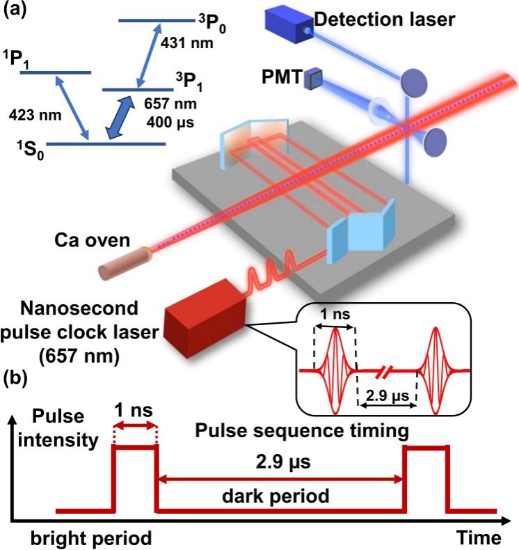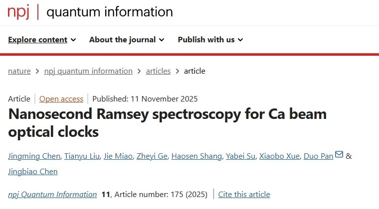 近日,电子学院陈景标教授团队在钙束光钟关键技术领域取得重要进展。针对钙原子束光钟稳定度受限于量子投影噪声极限这一瓶颈问题,团队提出纳秒拉姆塞光谱(Nanosecond Ramsey Spectroscopy)技术,实现原子束中全部横向速度原子的高效利用,使系统的量子投影噪声极限频率稳定度达到媲美国际最好的冷原子光晶格钟水平。这一成果不仅为突破传统热原子束光钟原子利用率低的长期瓶颈提供了原创性解决方案,也为构建新一代高精度守时飞轮光钟奠定了核心技术基础。相关研究成果以 “Nanosecond Ramsey spectroscopy for Ca beam optical clocks”为题,发表在 Nature 旗下的国际期刊 npj Quantum Information 上。