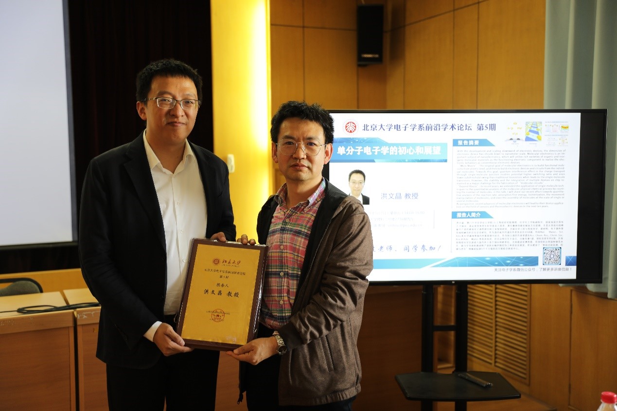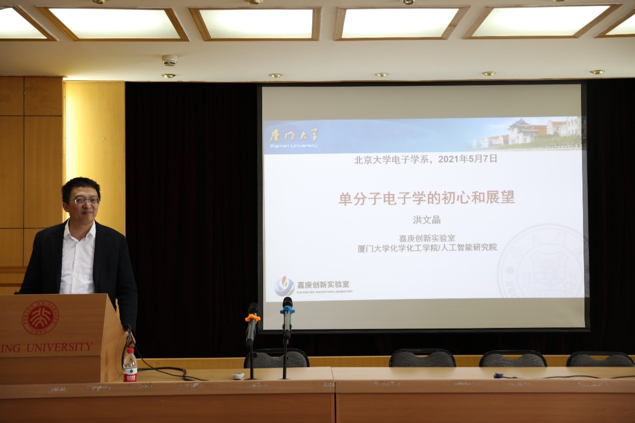 2021年5月7日下午,由电子学系主办的电子学系前沿学术论坛第五讲在北京大学理科二号楼2736报告厅顺利开讲。本次讲座的主讲嘉宾为厦门大学化学化工学院、人工智能研究院洪文晶教授,报告主题为“单分子电子学的初心和展望”。讲座由信息科学技术学院副院长、电子学系党总支书记侯士敏教授主持,全系50余名师生到场聆听了报告。
