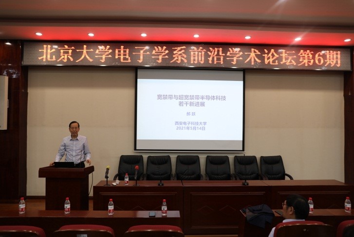 2021年5月14日下午,由电子学系主办的电子学系前沿学术论坛第六期在北京大学理科二号楼2129报告厅如期举行。本期论坛邀请到中国科学院院士、西安电子科技大学的郝跃教授作主题为“宽禁带与超宽禁带半导体科技的若干新发展”的学术报告。讲座由电子学系副系主任张志勇教授主持,全系近100名师生到场聆听了报告。