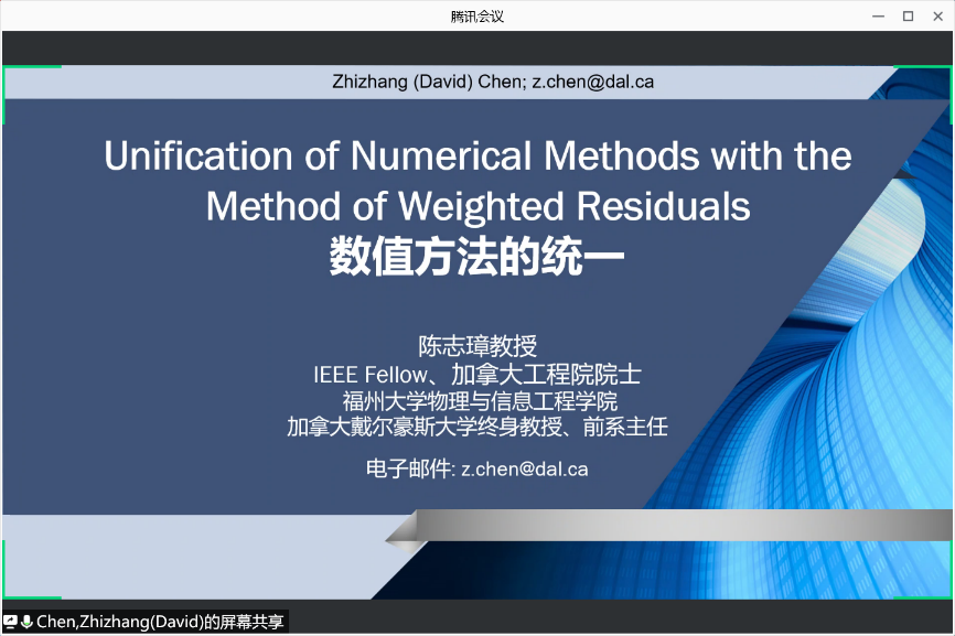 2021年12月17日下午,由北京大学电子学院主办的电子学院前沿学术论坛第二十三期通过网络顺利举行。本期论坛邀请到IEEE Fellow、加拿大工程院院士、福州大学物理与信息工程学院特聘教授、加拿大戴尔豪斯大学终身教授陈志璋做主题为“Unification of Numerical Methods with the Method of Weighted Residuals (基于加权余量法的数值方法的统一) ”和“中长距离无线能量传输-电磁技术与应用”的学术报告。讲座由电子学院应用电子学研究所夏明耀教授主持,60余名师生线上参加了本次学术报告。