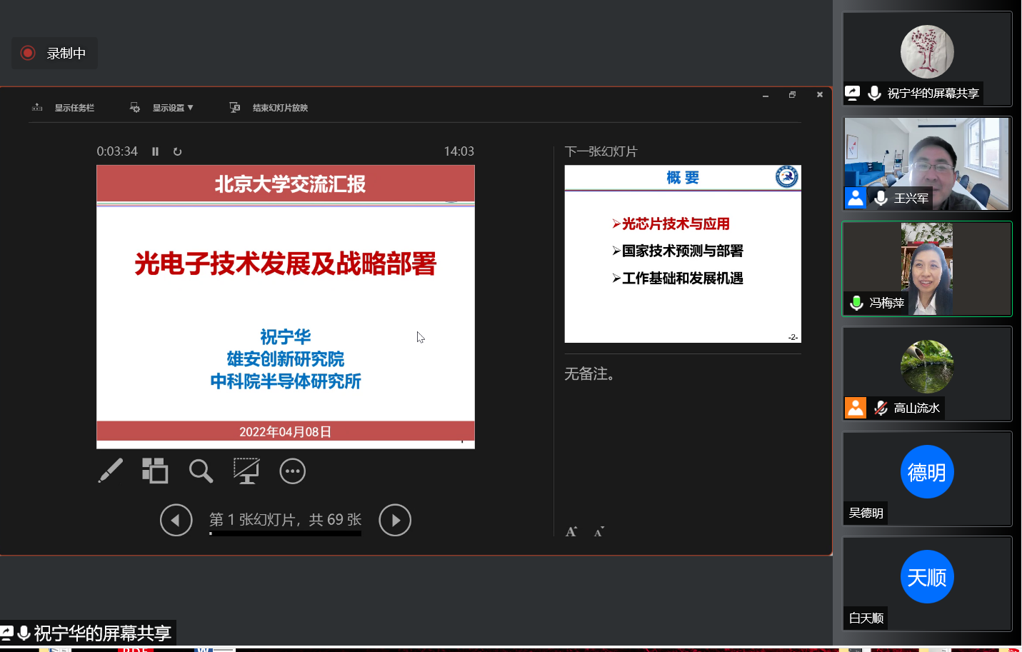 2022年4月8日下午,由北京大学电子学院主办的电子学院前沿学术论坛第二十五期通过网络顺利举行。本期论坛邀请到中国科学院信息技术科学部院士、中国科学院半导体研究所研究员祝宁华教授做主题为“光电子技术发展及战略部署”的学术报告。讲座由电子学院信息与通信研究所王兴军教授主持,120余名师生线上参加了本次学术报告。