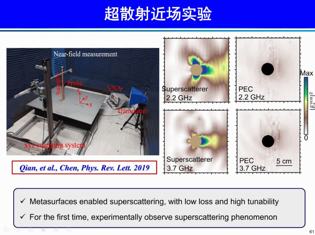 接下来,陈红胜教授为我们介绍了超散射现象的实验实现。通过增强物体散射,使其显著大于同等尺寸的其他物体,可以实现超散射。实现超散射的方法主要有:补偿介质超散射和等离激元超散射方法。补偿介质法超散射材料往往电磁参数非均匀且各向异性,实验难度大;等离激元超散射材料工作频率单一、结构复杂、损耗大。面临以上挑战,陈教授团队设计了一种基于超表面的多频超散射方法,并在近场和远场实验进行验证。