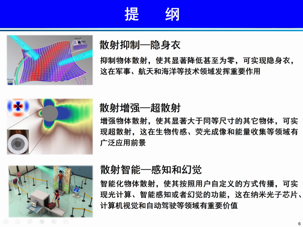 讲座伊始,陈红胜教授由电磁散射理论、超材料基础理论及其应用引入本次报告的主要内容:散射抑制、散射增强和散射智能三个方面,随后展开了精彩报告。