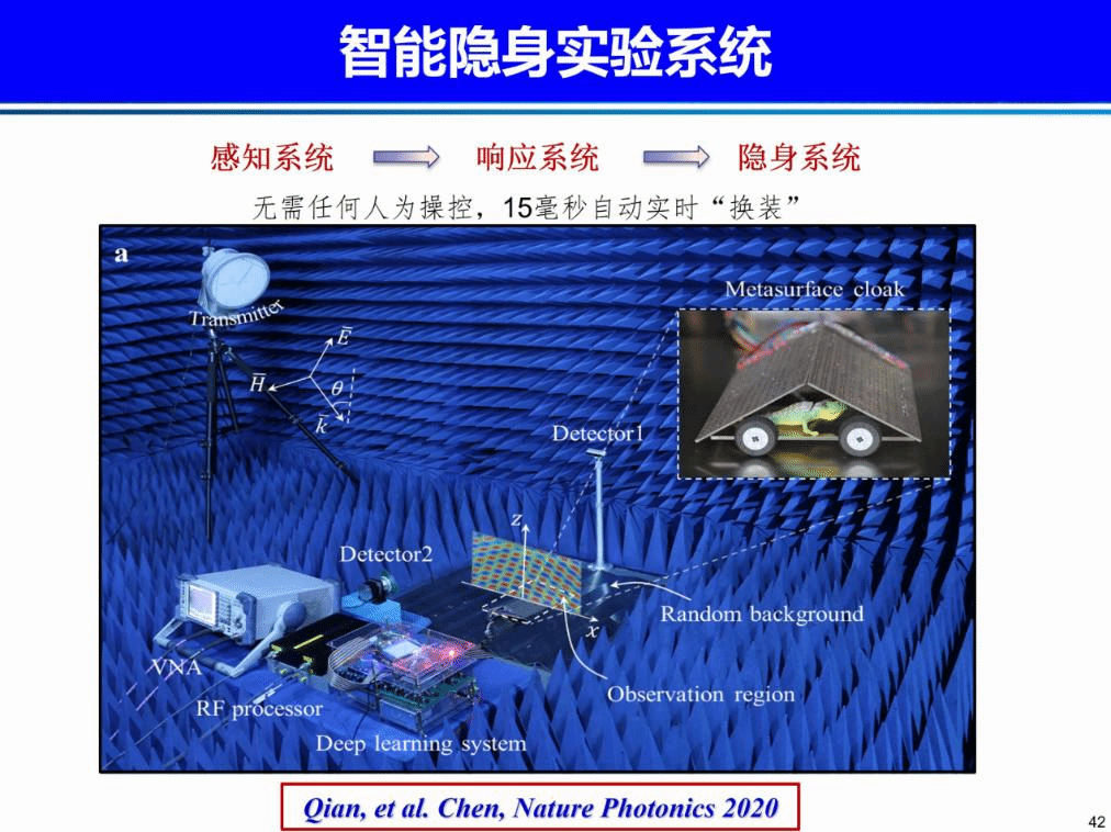 首先,陈红胜教授带我们回顾了近年来隐身衣的前期发展、隐身机理及遇到的挑战。通过抑制物体散射,使其显著降低甚至为零,可实现隐身衣,在军事、航天和海洋等技术领域发挥重要作用。在传统隐身的基础上,提出新型隐身方法——透明隐身:让波绕过物体,实现任意背景下隐身。新型隐身技术面临三个主要挑战:与电磁波相互机理尚不清楚,隐身衣参数苛刻、设备复杂,隐身衣频带窄、色散严重。基于上述挑战,陈教授从隐身衣机理、空间波隐身和表面波隐身等三个方面介绍了新型隐身衣的发展。通过研究电磁波隐身衣散射理论及设计实验,证明了电磁波完美隐身的可行性。为解决隐身衣工作频带窄的问题,陈教授团队提出波矢空间相位重构的宽频带隐身新方法,并在可见光频段和远红外频段进行了实验验证,同时将二维隐身拓展到三维立体隐身。特别地,陈教授介绍了一种支持深度学习的自适应微波斗篷,可以实现毫秒级速度自适应不断变化的入射波和周围环境,与背景电磁环境特征融为一体。