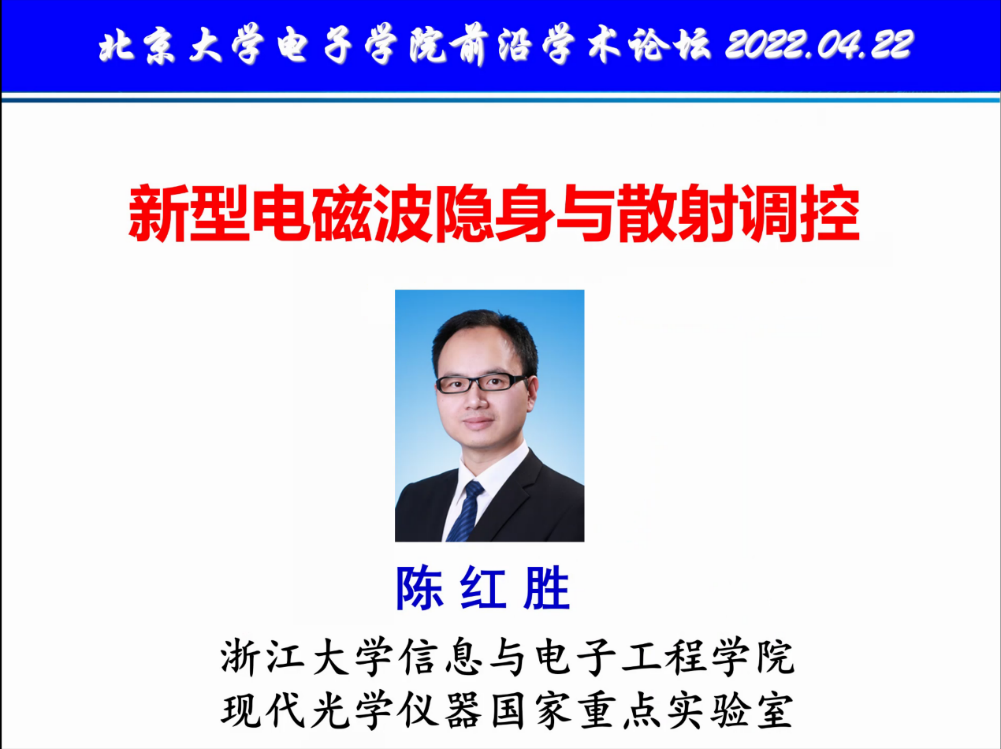 2022年4月22日下午14:00,由北京大学电子学院主办的电子学院前沿学术论坛第二十七期通过网络顺利举行。本期论坛邀请到教育部长江特聘教授,国家杰出青年基金获得者,IEEE Fellow,浙江大学信息与电子工程学院院长陈红胜教授做主题为“电磁波隐身与散射调控”的学术报告。讲座由电子学院应用电子所李廉林老师主持。60余名师生线上参加了本次学术报告。