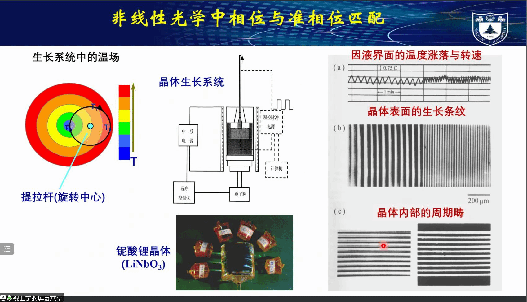 由于在实验上难以制作出能够实现准相位匹配的晶体,这一领域在实验上的研究进展比较缓慢。70年代时,南京大学物理系在做铌酸锂生长实验时发现,提拉晶体会导致晶体表面和内部出现周期性微结构。经过多次实验优化条纹间距,确认了这种结构可以实现激光的准相位匹配。1980年,王大珩先生组织了中国的第一次国际激光研讨会,该工作被选中在会议上报告。报告引起了美国科学家的极大兴趣,他们惊讶地发现这个一直困扰准相位匹配研究的问题被中国科学家用这样的方法解决了。
