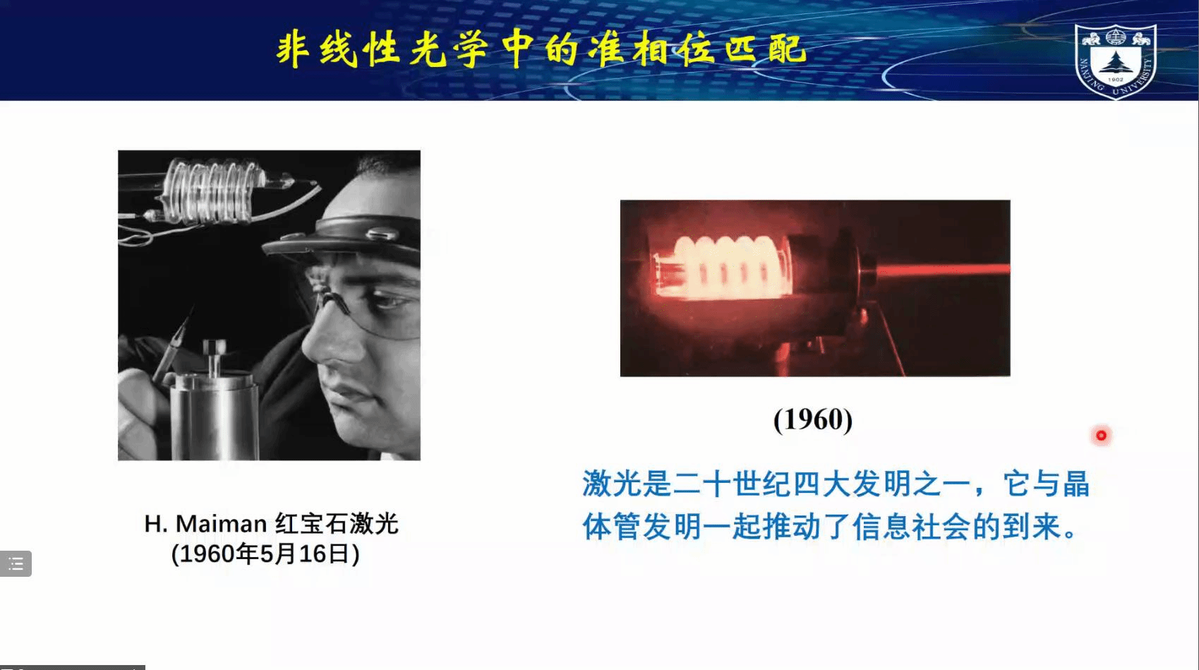 在讲座开始,祝院士介绍了非线性光学中的准相位匹配的早期发展。1960年,H. Maiman发明了红宝石激光器。1961年,P. Franken等人实现激光的倍频,但是转化的效率很低。这是色散所导致的激波光和倍频光位相不匹配造成的。1962年,P.D. Maker等人利用晶体双折射实现了双折射位相匹配(BPM),进而实现了高效激光倍频。同年,N. Bloembergen等人发表了著名的关于非线性光学中准相位匹配的文章,提出了准相位匹配的原理和三种准相位匹配的方法。