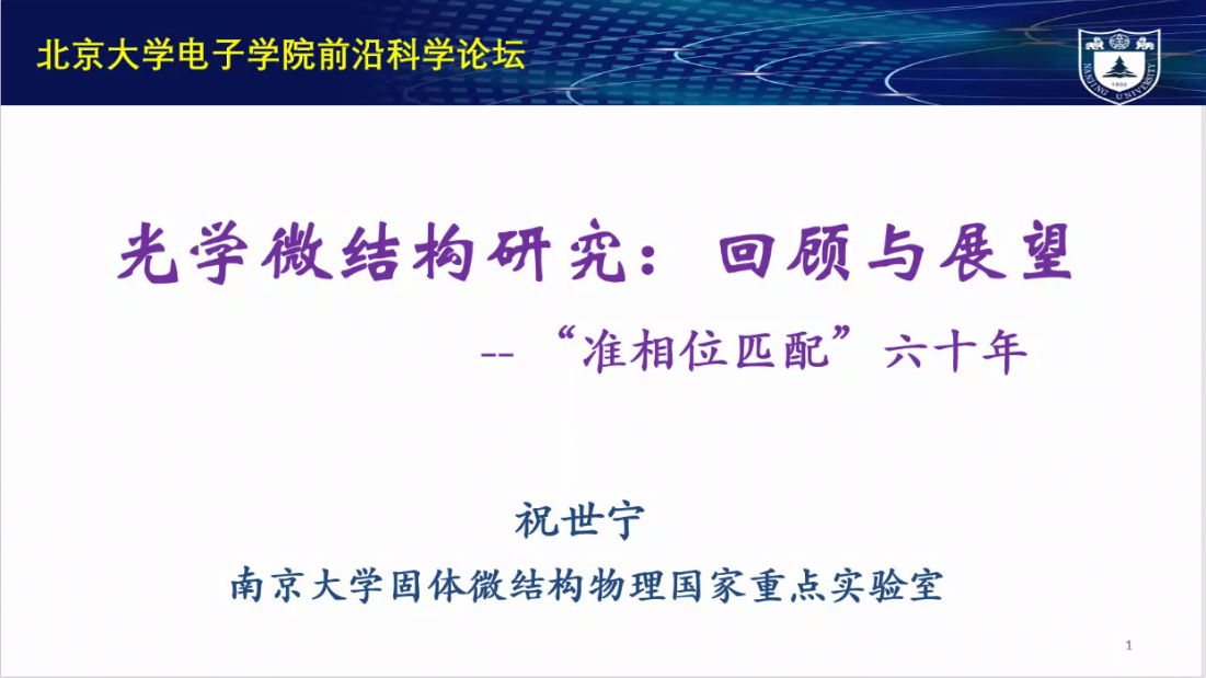 2022年6月17日下午14:00,由北京大学电子学院主办的电子学院前沿学术论坛第33期通过网络顺利举行。本期论坛邀请到南京大学固体微结构物理国家重点实验室祝世宁院士做主题为“光学微结构研究:回顾与展望——‘准相位匹配’六十年”的学术报告。讲座由电子学院量子电子学研究所郭弘教授主持,120余名师生线上参加了本次学术报告。
