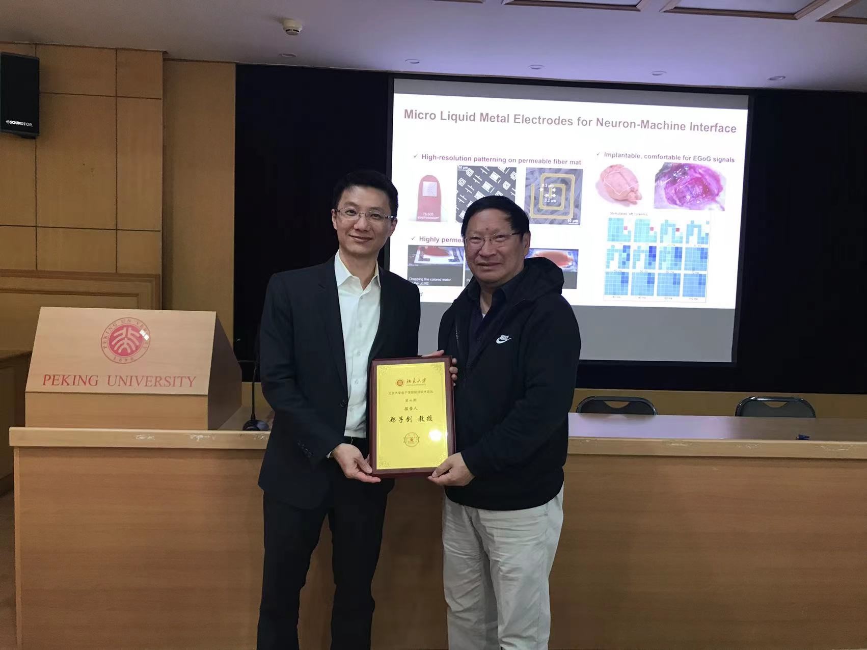 报告结束时,电子学院院长彭练矛院士为郑子剑教授颁发了北京大学电子学院前沿学术论坛纪念牌。