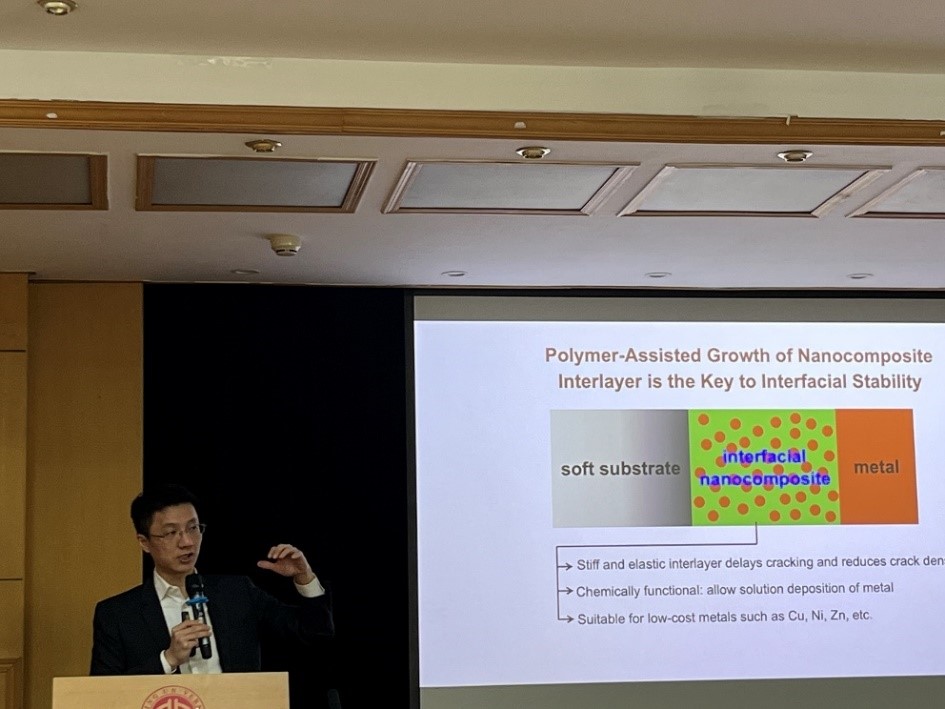 在提问环节,郑教授与参会师生就液体金属如何固定在fiber mat上,光刻技术在fiber mat上的加工工艺等一系列问题展开讨论。