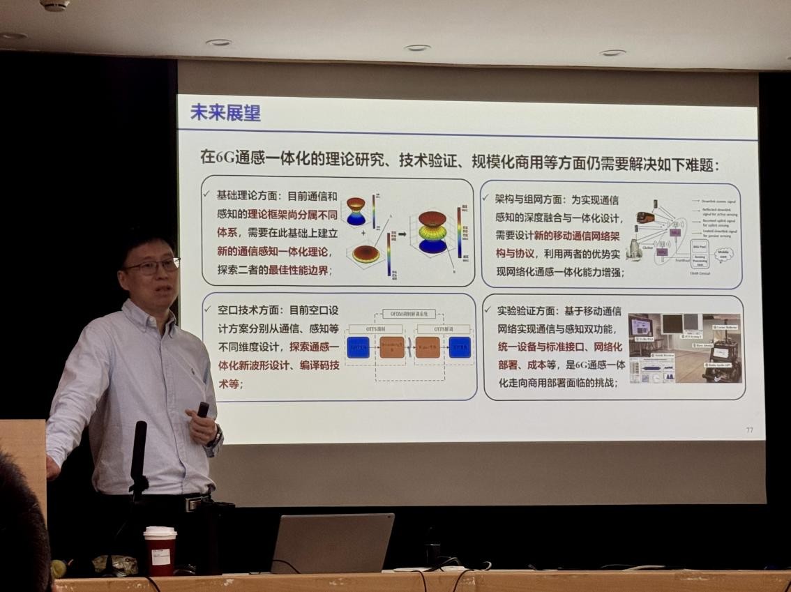 最后,张教授对未来进行了展望。通感一体化的技术条件逐渐成熟,在社会生产生活中有着广大的应用前景,已成为各大国际标准组织的研究热点。但张教授也指出,6G通感一体化的理论研究、技术验证、规模化商用等方面仍然存在着一些问题,例如通信与感知理论框架分离、空口设计方案不同、网络架构不同、设备标准不统一的问题。张教授强调,通感一体不是具体的某一样通信技术与感知技术的结合,要更开放地理解通信与感知的协同,将其理解为抽象意义上的通信与感知相互配合。