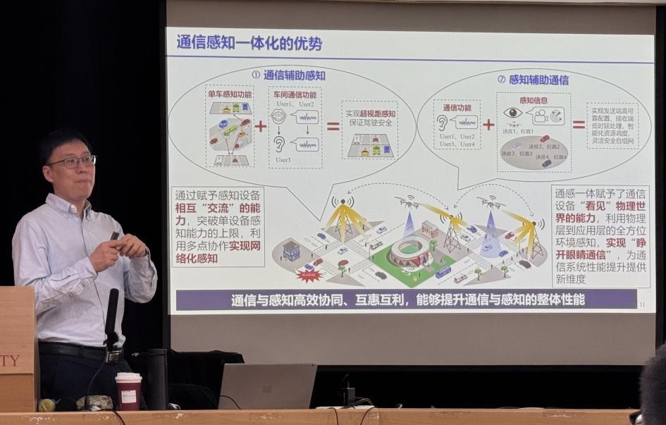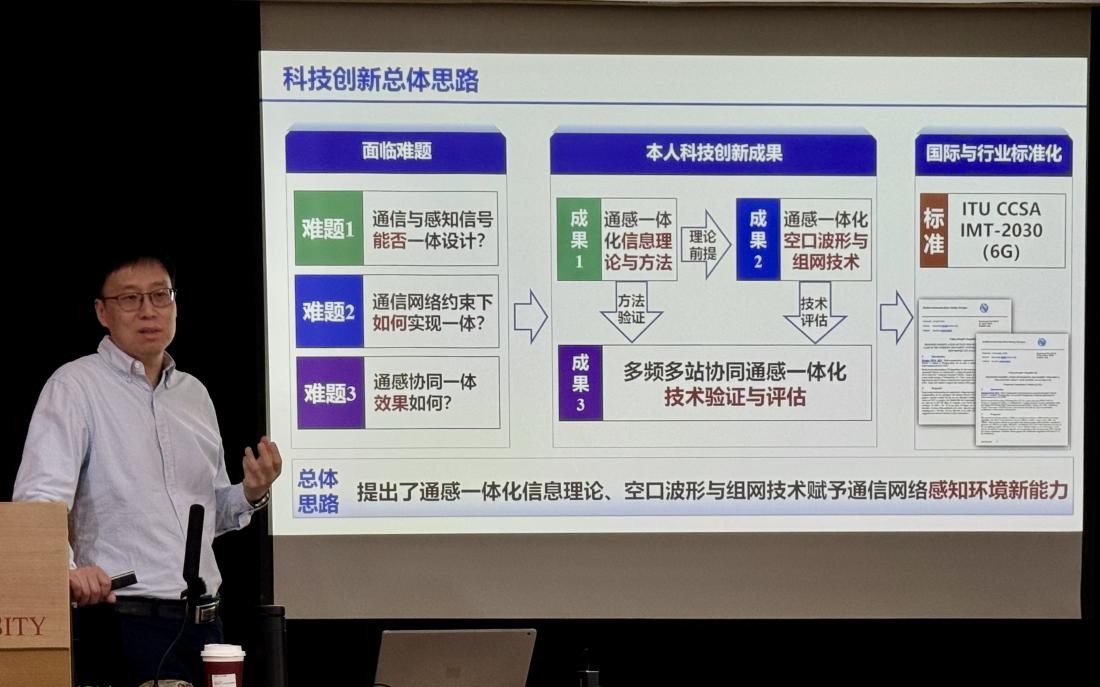 随后,张教授概括了当今通感一体化研究面临的难题与挑战,包括一、通信信号的随机性与感知信号的结构化之间存在矛盾,如何将通信与感知的信号与功能一体设计?二、通信应用对信号的帧结构与网络架构有着具体的限制,如何在这些限制下实现通感一体?三、通信与感知共享资源,相互竞争,如何实现通信与感知的相互协同,如何评估通感协同的效果?张教授结合具体案例,由浅入深地讲解了这三大难题的含义与重要性。