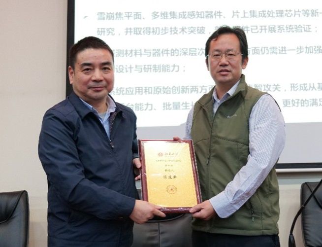 这场长达两个小时的讲座高屋建瓴、内容翔实,为在座学子带来了一场关于红外科技前沿的思想盛宴。陈建新老师所展现的深厚学养与前瞻视野,不仅深化了听众对技术本身的理解,更在科研方法论、学业规划与职业选择上带来了深刻启迪,令人受益匪浅。报告结束后,电子学院学术委员会主任张志勇教授为陈建新老师颁发了北京大学电子学院前沿论坛纪念牌,并合影留念。本次论坛在热烈的掌声中圆满落幕。