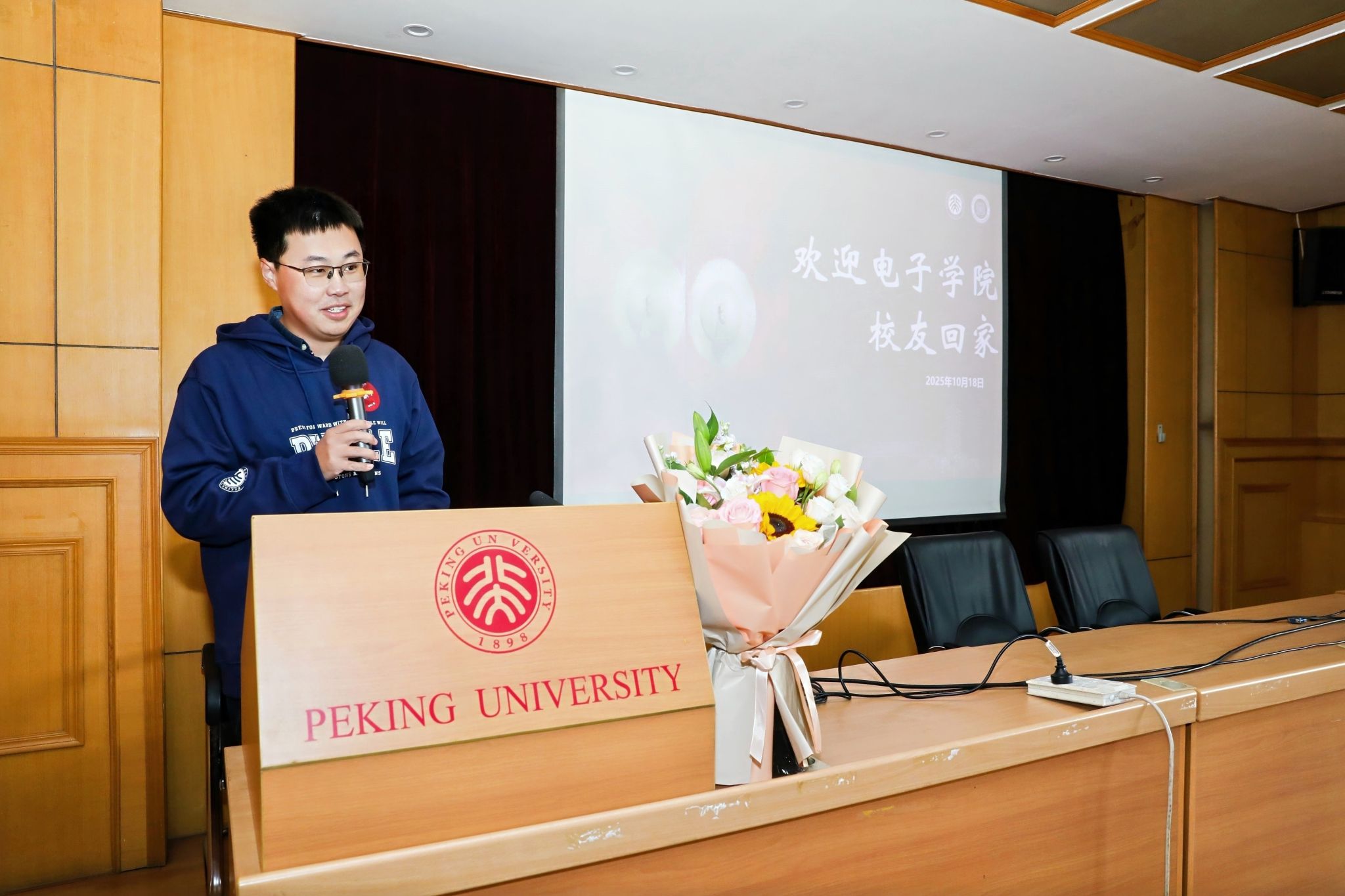 上午10时,北京大学电子学院秩年校友返校纪念活动正式拉开帷幕,活动由2005级校友刘鹏宇主持。他首先代表学院对各位学长学姐、学弟学妹的归来表示热烈欢迎,并以校友特有的亲切感,迅速拉近了四届电子人之间的时空距离,将现场氛围带回到了在校时的真挚与热情。